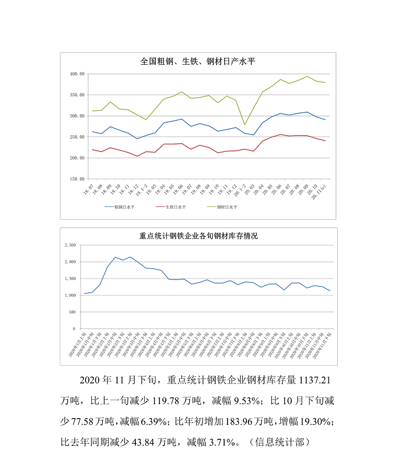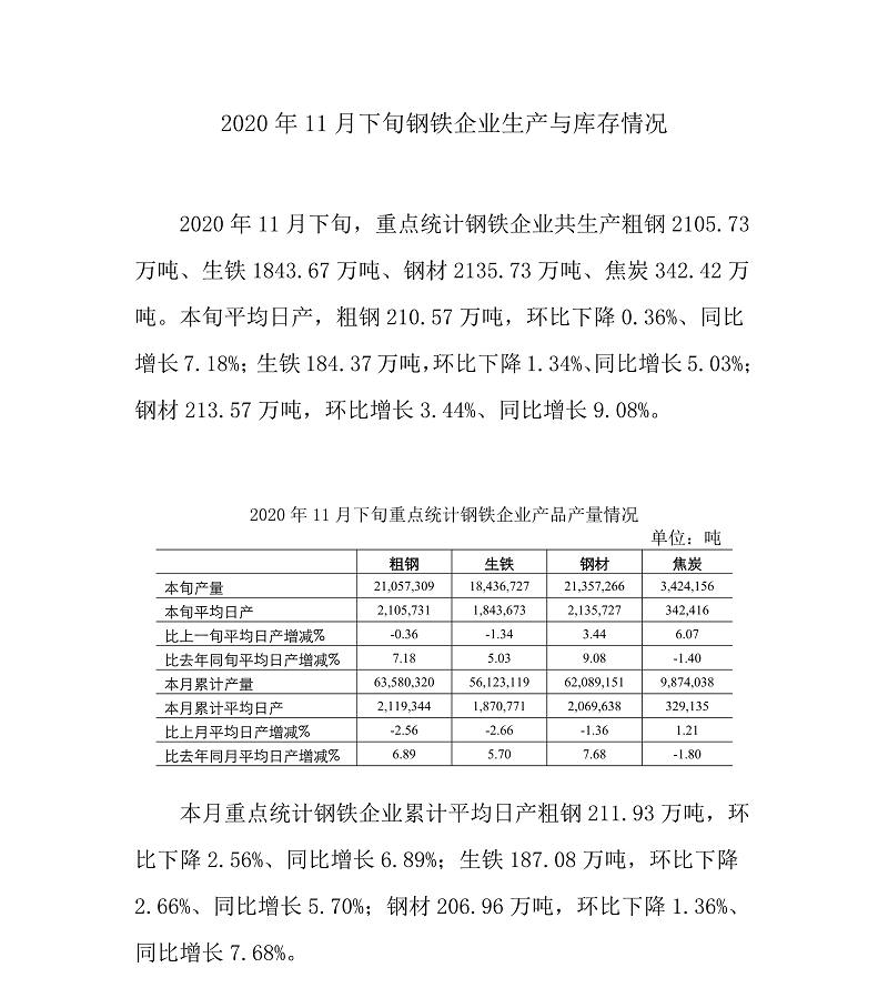 2020年11月下旬,重點統計鋼鐵企業共生產粗鋼2105.73萬噸、生鐵1843.67萬噸、鋼材2135.73萬噸、焦炭342.42萬噸。