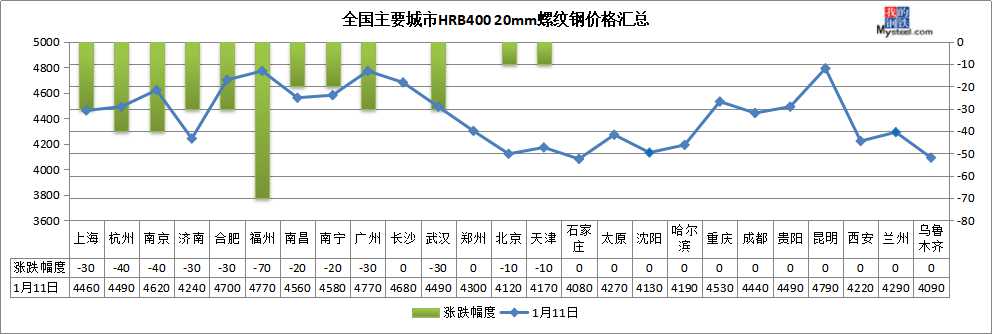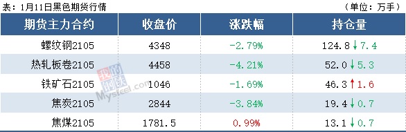 建筑鋼材:1月11日,全國25個主要城市20mm三級螺紋鋼均價4419元/噸,較上個交易日下跌14元/噸。具體來看,期螺震蕩走低,上午國內建筑鋼材價格穩中有松。午后隨著期貨繼續下挫,市場心態低迷,全天成交表現較差。目前來看,臨近春節假期,多數商家主動冬儲意愿不強,市場交投氛圍或逐步減弱,庫存持續累積。因此預計明日國內建筑鋼材價格或繼續偏弱震蕩。