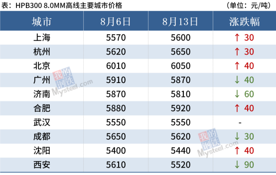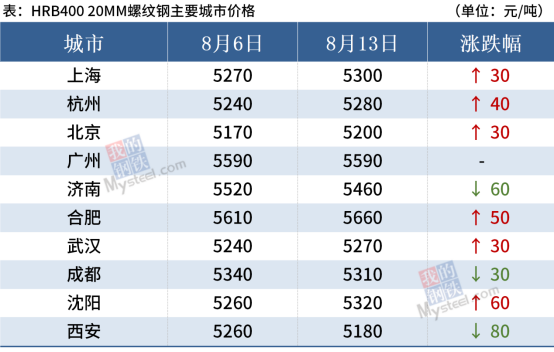 截至8月13日,全國主要城市20mm三級螺紋鋼均價5360元/噸,周環(huán)比上漲11元/噸;8.0mmHPB300高線均價5649元/噸,周環(huán)比上漲14元/噸。