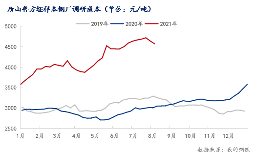盈利情況:本周唐山地區(qū)主流樣本鋼廠平均鐵水不含稅成本為3587元/噸,平均鋼坯含稅成本4558元/噸,周比下調(diào)17元/噸,與8月13日當(dāng)前普方坯出廠價格5090元/噸相比,鋼廠平均毛利潤532元/噸,周比上調(diào)27元/噸。