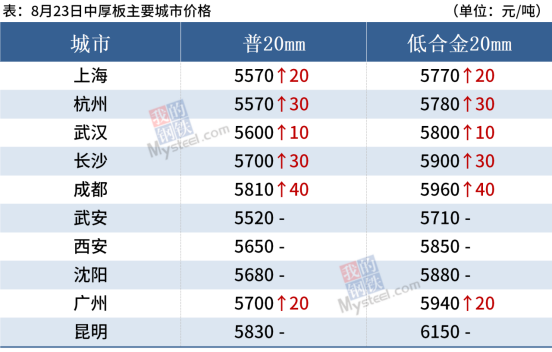 中厚板:8月23日,全國24個主要城市20mm普板均價5664元/噸,較上個交易日價格上漲13元/噸。供應層面看,近期鋼廠檢修、復產頻率依舊較高,產量處于略微偏低水平,但是隨著鋼廠利潤的擴張,部分鋼廠有推遲檢修計劃,未來中板產量降幅或有限。流通環節看,由于前段時間北方鋼廠一單一議價格較高,且南北價差收窄,訂貨需求顯著下滑,導致近期市場到貨量有所下降,社庫增幅較小,緩解累庫壓力。需求方面,隨著這輪中板價格的深度調整,投機需求下降,下游采購節奏放緩,部分需求被抑制,但從上周五市場情況看,現貨企穩后,需求在本周將有一定程度放量。綜合預計,24日中厚板價格小幅上漲為主。