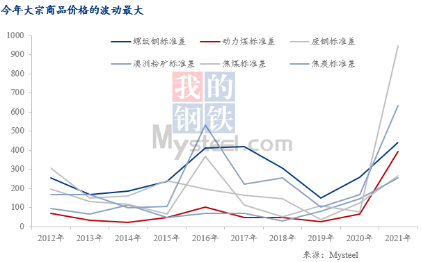 2021年,受國內(nèi)外政策變幻多端影響,大宗商品價格波動異常。Mysteel從以下幾個方面對2021年大宗商品價格波動的原因展開分析。1)海外超寬松的宏觀政策刺激,使得全球?qū)Υ笞谏唐返男枨笸ⅲ瑫r間接地導(dǎo)致中國出口一直保持在高水平。2)供給沖擊造成了大宗商品價格較大的波動。3)以鋼鐵行業(yè)為例,供給沖擊主要表現(xiàn)為“三輪限產(chǎn)”,使得鋼鐵市場對政策預(yù)期較難錨定。4)房地產(chǎn)行業(yè)嚴(yán)調(diào)控,基建投資低迷,下半年鋼鐵需求急速收縮。5)供需錯配導(dǎo)致煤炭價格波動異常。6)外部環(huán)境復(fù)雜多變是我國大宗商品價格起伏的重要原因。