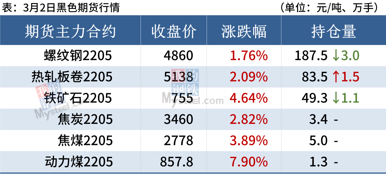 建筑鋼材:3月2日,全國31個主要城市20mm三級抗震螺紋鋼均價4924元/噸,較上個交易日漲33元/噸。市場方面,冬奧會結束,北方地區限產逐漸放松,供應有所回升。不過近期多數地區天氣好轉,需求逐漸恢復,供需基本面有所好轉。短期來看,在需求逐漸釋放的前提下,現貨存有較強支撐。不過近期原料受政策性約束影響,或制約成材反彈空間。因此預計3日國內建筑鋼材或將漲勢趨緩。