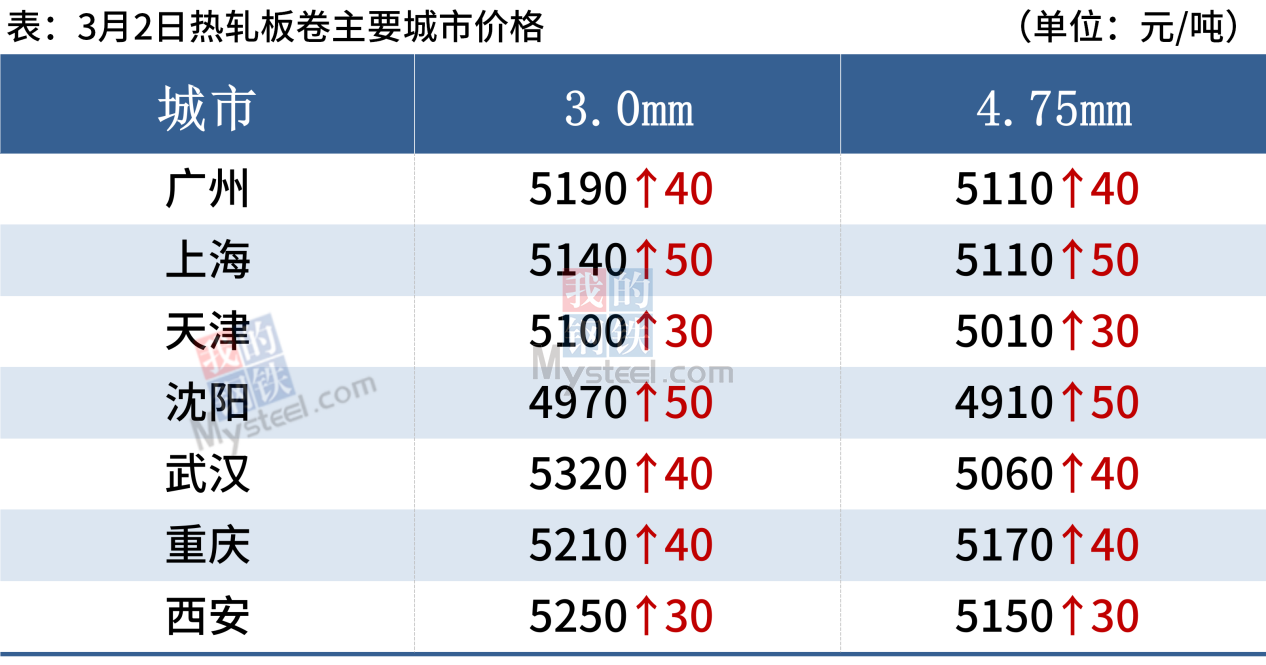 熱軋板卷:3月2日,全國24個主要城市4.75mm熱軋板卷均價5120元/噸,較上個交易日上漲41元/噸。早盤大漲,現貨報價繼續上漲,成交表現尚可,午后期卷漲幅收縮,下游采購量放緩,全天成交一般。綜合來看,3月份在冬奧會結束后,兩會、殘奧會即將開幕,3月份產量雖然會有上升但幅度不大,市場到貨壓力小幅減小,以及穩增長政策的刺激下,下游需求或將持續增長,實現供需緊平衡。綜合來看,預計3日熱軋板卷價格或震蕩偏強為主。