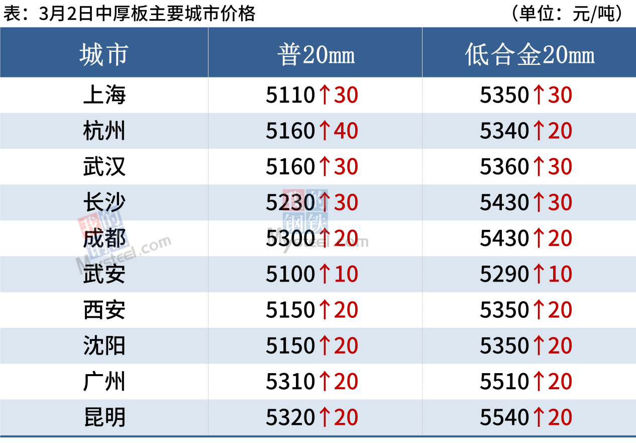 中厚板3月2日,全國24個主要城市20mm普板均價5213元/噸,較上一交易日上漲20元/噸。在盤面震蕩上行的帶動下,多數區域市場報價小幅探漲,受限于實際需求并未明顯改善,整體價格拉漲空間有限。成交方面,雖整體價格維持上揚,但多數區域下游采購仍較為謹慎,因此中厚板整體成交表現一般。資源方面,部分市場出現個別規格緊俏,中厚板現貨庫存小幅回落。綜合來看,預計3日中厚板價格仍將以趨強盤整為主。