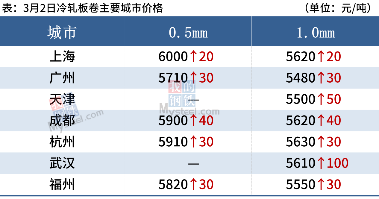 冷軋板卷:3月2日,全國24個主要城市1.0mm冷卷均價5602元/噸,較上個交易日上漲30元/噸。期貨上漲為主,商家心態樂觀為主。下游方面,下游開工情況有所好轉,補庫意愿偏強,采購積極性有所提振。商家整體出貨情況一般。綜上所述,預計3日冷軋價格或將震蕩偏強運行。