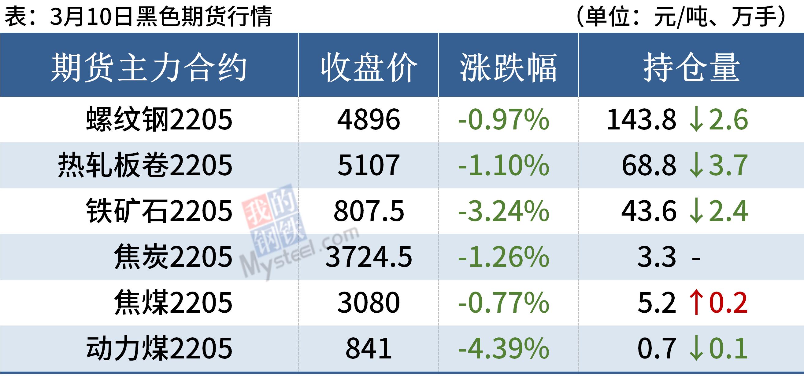 建筑鋼材:3月10日,全國31個主要城市20mm三級抗震螺紋鋼均價4961元/噸,較上個交易日下跌34元/噸。本周供給繼續小增,庫存迎來拐點,且降幅尚可。綜合來看,目前供給仍然處于回升階段,但整體增量有限;需求方面,隨著天氣逐漸好轉,需求有所回升。考慮到近期國際形勢仍然不穩,短期現貨市場受情緒波動影響較大。因此預計11日國內建筑鋼材價格將繼續窄幅趨弱為主。