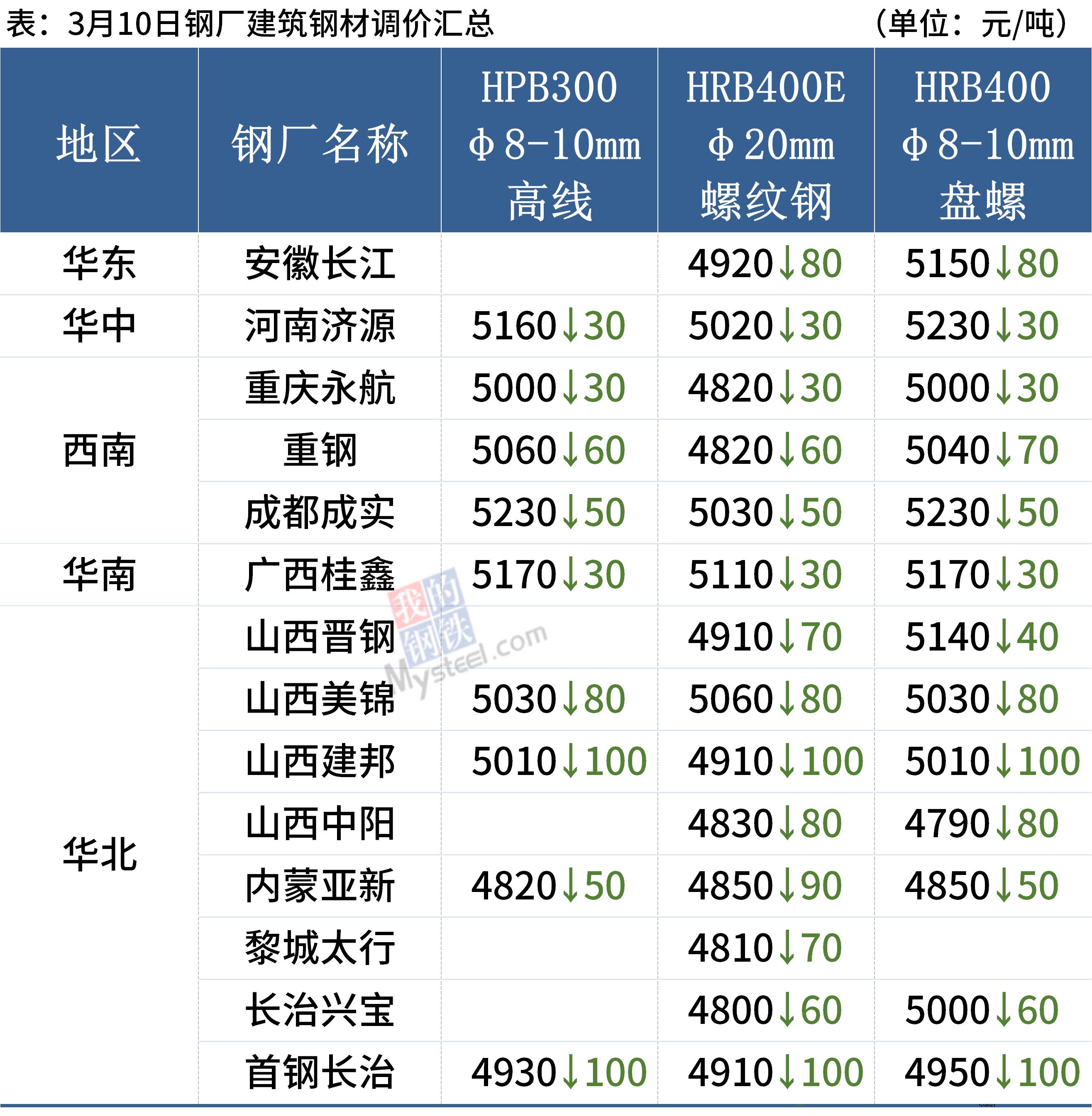10日,國內14家鋼廠下調出廠價30-100元/噸。