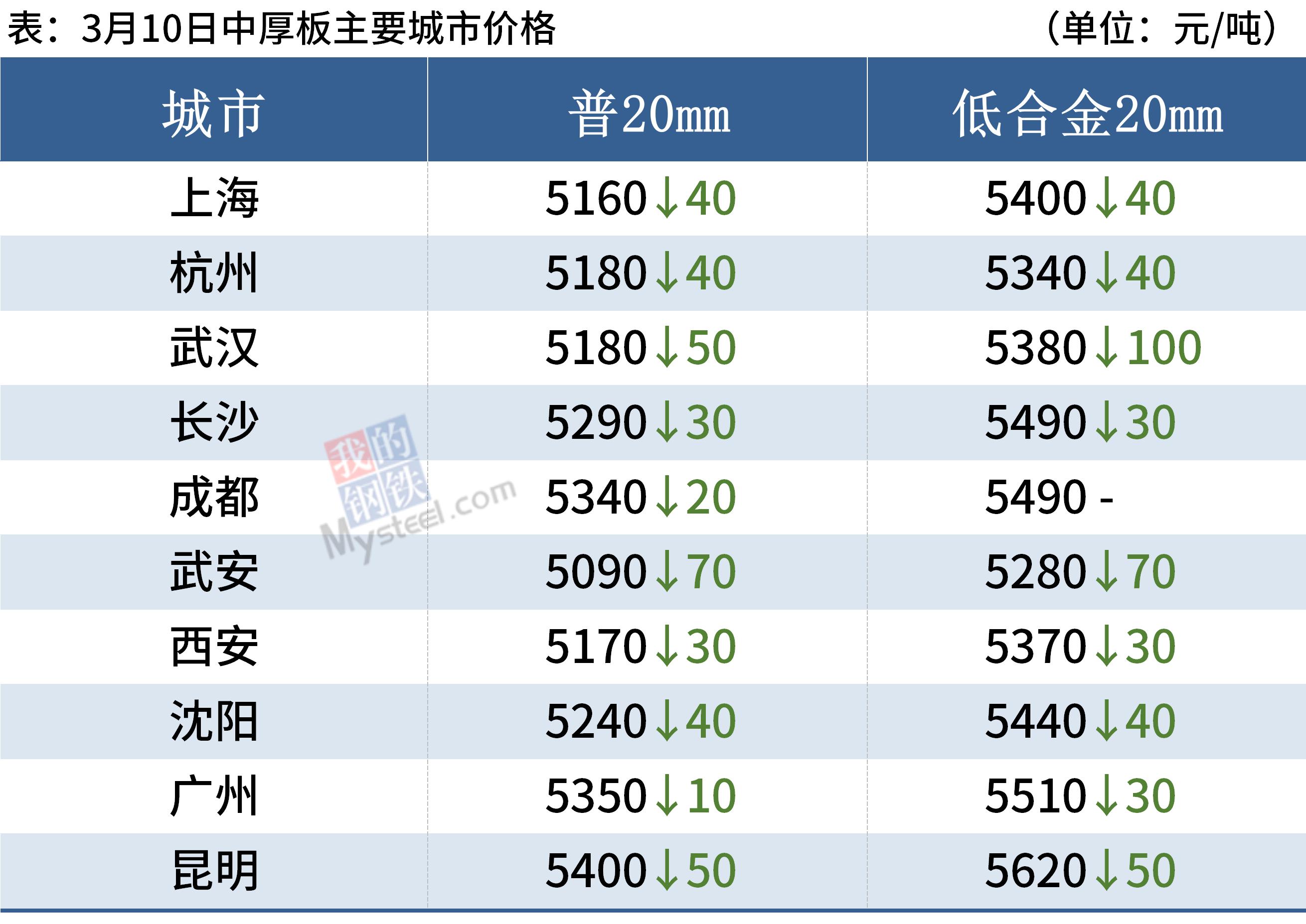 中厚板:3月10日,全國24個主要城市20mm普板均價5250元/噸,較上個交易日下跌33元/噸。據Mysteel周度鋼材產量、庫存數據顯示,本周中板產量減4.06萬噸,廠庫降2.70萬噸,社庫降4.66萬噸,產量庫存雙減,鋼廠受原料漲價及兩會影響,一定程度減量,貿易商投機性需求較少,備貨水平整體有所下降,需求方面小幅回升,程度有限。綜合預計,11日國內中厚板價格震蕩調整為主。