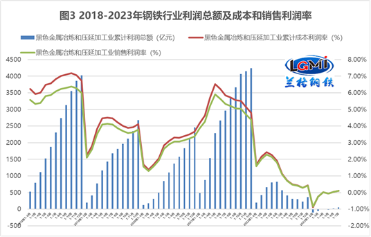 從全國粗鋼產量及噸鋼利潤的數據來看,國內鋼鐵生產企業利潤空間呈現持續改善的態勢(詳見圖1),綜合成本展現出了頂部下滑的態勢(詳見圖2),由于鋼材價格的震蕩反彈與原料價格的相對韌性,使得鋼企的盈利得到了持續的改善(詳見圖3),但鋼鐵生產企業依然面臨著成本相對韌性與需求結構調整的雙重壓制。
