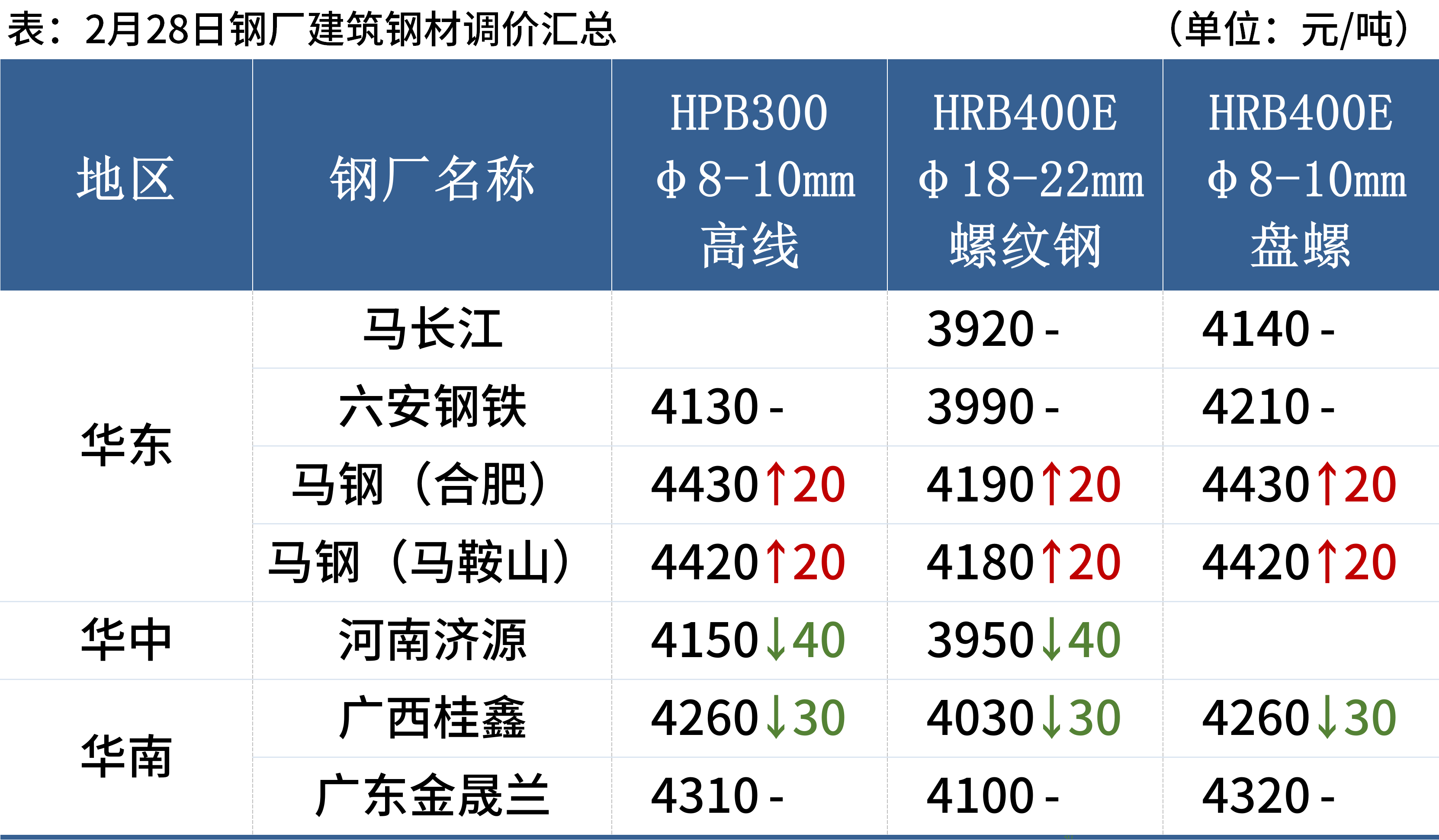 2月28日,2家鋼廠建筑鋼材出廠價(jià)格下調(diào)30-40元/噸,1家上調(diào)20元/噸