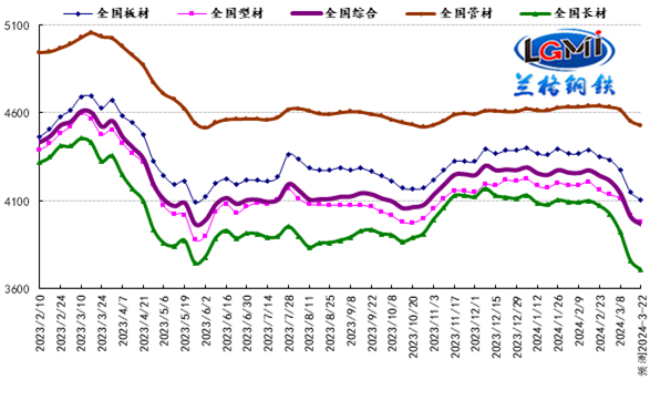 2024年第11周(2024.3.11-3.15)蘭格鋼鐵全國絕對價格指數為4009元,較上周下降3.1%,較去年同期下降13.8%。其中,蘭格鋼鐵長材絕對價格指數為3759元,較上周下降3.9%,較去年同期下降16.0%;蘭格鋼鐵型材絕對價格指數為4015元,較上周下降2.3%,較去年同期下降13.1%;蘭格鋼鐵板材絕對價格指數為4151元,較上周下降2.8%,較去年同期下降12.6%;蘭格鋼鐵管材絕對價格指數為4553元,較上周下降1.4%,較去年同期下降10.0%。