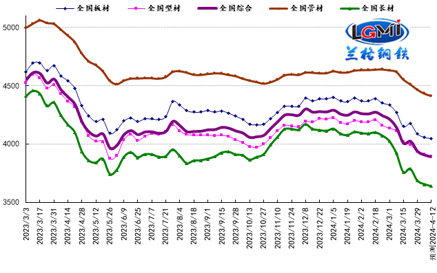 2024年第14周(2024.4.1-4.7)蘭格鋼鐵全國絕對價格指數為3909元,較上周下降1.1%,較去年同期下降12.5%。其中,蘭格鋼鐵長材絕對價格指數為3654元,較上周下降1.1%,較去年同期下降14.0%;蘭格鋼鐵型材絕對價格指數為3912元,較上周下降0.9%,較去年同期下降11.7%;蘭格鋼鐵板材絕對價格指數為4059元,較上周下降1.2%,較去年同期下降11.5%;蘭格鋼鐵管材絕對價格指數為4432元,較上周下降0.9%,較去年同期下降11.0%。