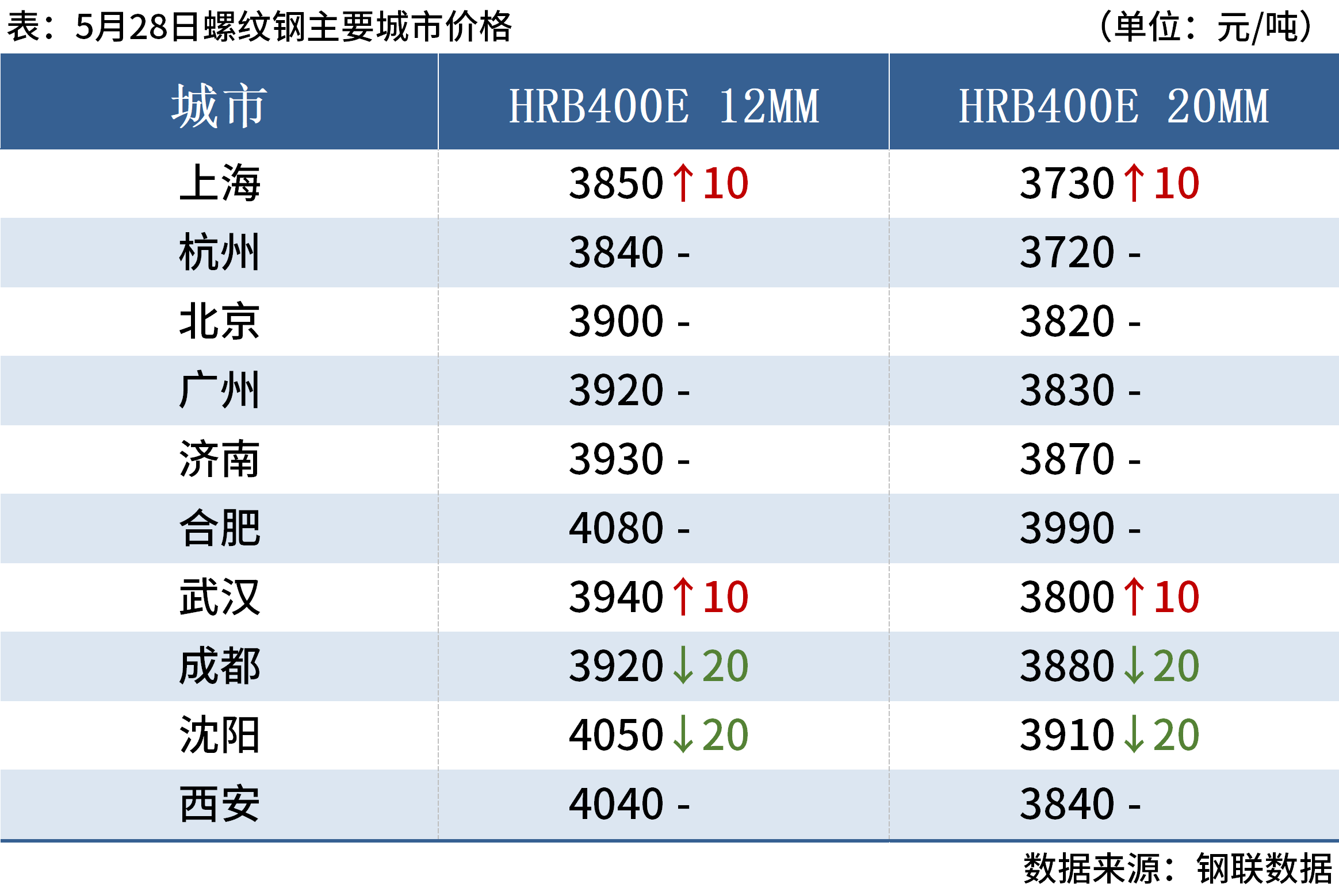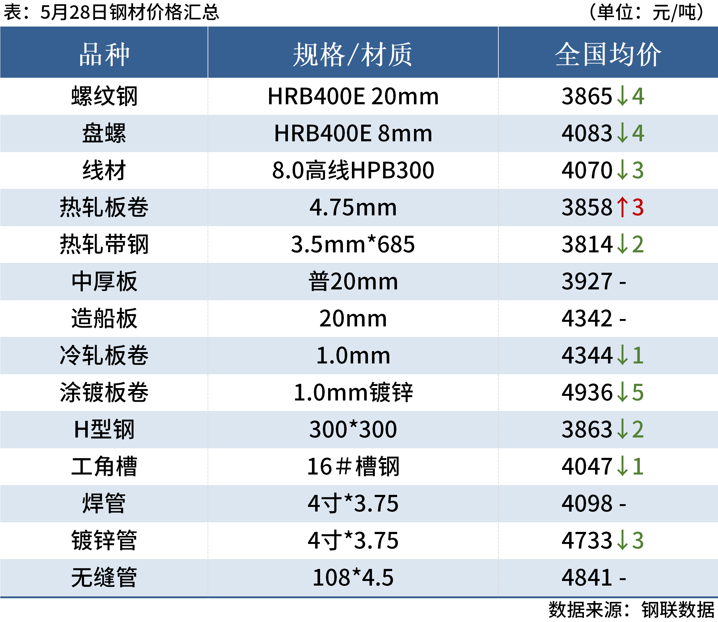 螺紋鋼:5月28日,國內建筑鋼材價格漲跌互現。全國主要城市螺紋鋼均價3865元/噸,較上個交易日下跌4元。具體來看,期螺早盤偏強震蕩,上午國內現貨價格主流持穩,部分城市小幅探漲。午后期螺沖高回落,部分城市現貨價格出現松動,商家反饋市場整體需求表現疲軟,成交較上一交易日相比偏弱。短期來看,一方面近期鋼廠利潤修復,產量仍有增長空間,另一方面,隨著螺紋鋼去庫放緩,消費端或階段性見頂,預計29日國內建筑鋼材價格或將震蕩運行為主。