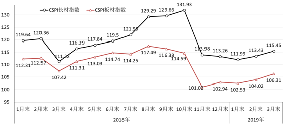 CSPI國(guó)內(nèi)長(zhǎng)材和板材價(jià)格指數(shù)走勢(shì)圖