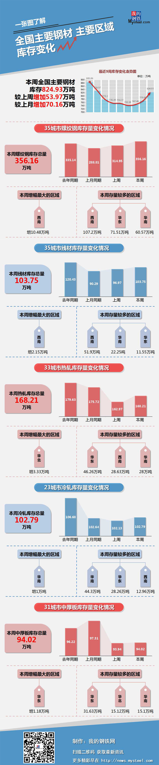 本周,全國主要鋼材社會庫存824.93萬噸,較上周增加53.97萬噸,較上月增加70.16萬噸;螺紋鋼庫存總量356.16萬噸。
