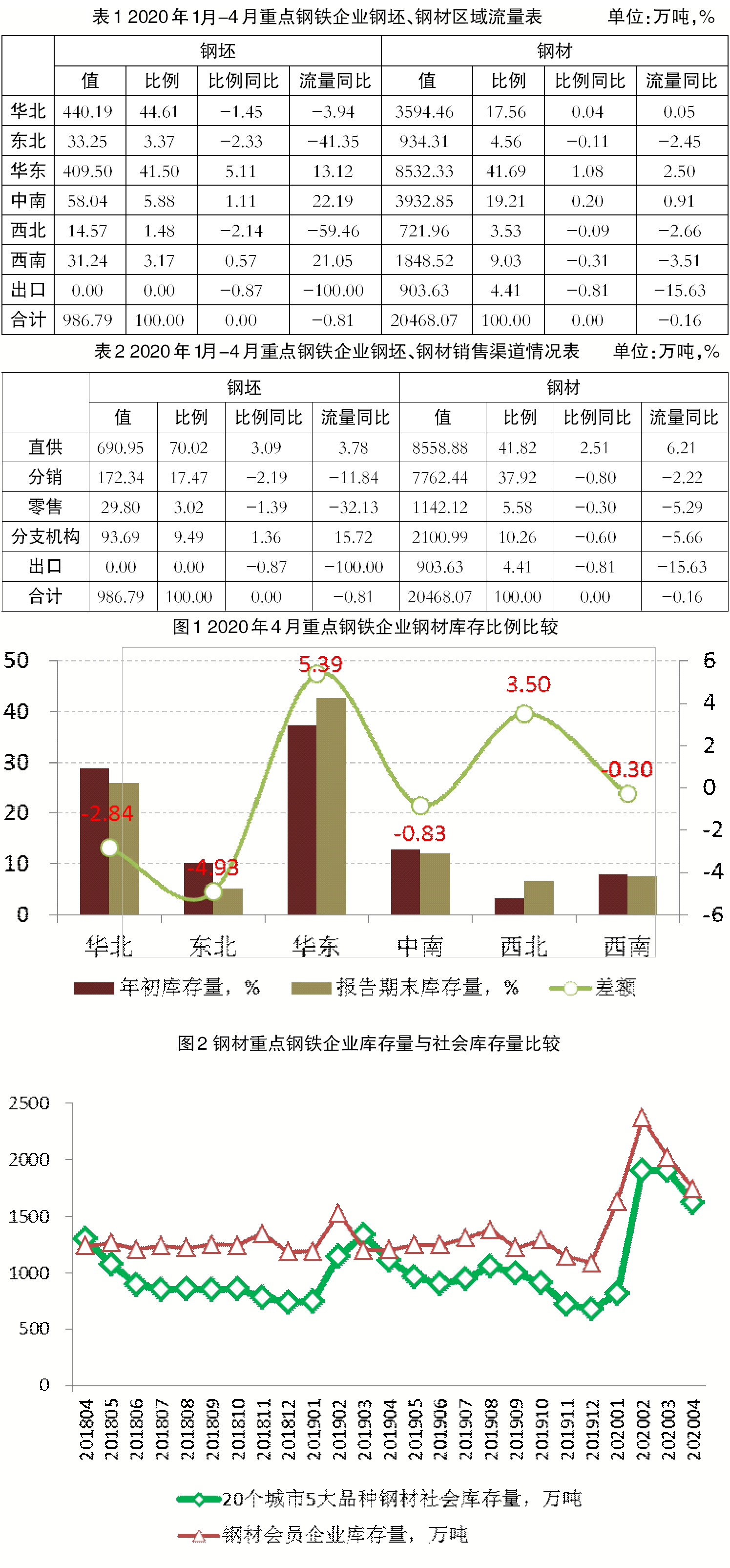1月~4月份,華北地區(qū)鋼鐵企業(yè)在國內(nèi)共銷售鋼材6105.58萬噸,比2019年1月~4月份增加245.71萬噸,同比上升4.19%;東北地區(qū)鋼鐵企業(yè)在國內(nèi)共銷售鋼材1970.16萬噸,比2019年1月~4月份增加70.63萬噸,同比上升3.72%;華東地區(qū)鋼鐵企業(yè)在國內(nèi)共銷售鋼材6541.37萬噸,比2019年1月~4月份減少56.89萬噸,同比下降0.86%;中南地區(qū)鋼鐵企業(yè)在國內(nèi)共銷售鋼材2953.98萬噸,比2019年1月~4月份增加47.42萬噸,同比上升1.63%;西北地區(qū)鋼鐵企業(yè)在國內(nèi)共銷售鋼材780.16萬噸,比2019年1月~4月份減少70.89萬噸,同比下降8.33%;西南地區(qū)鋼鐵企業(yè)在國內(nèi)共銷售鋼材1213.19萬噸,比2019年1月~4月份減少101.41萬噸,同比下降7.71%。