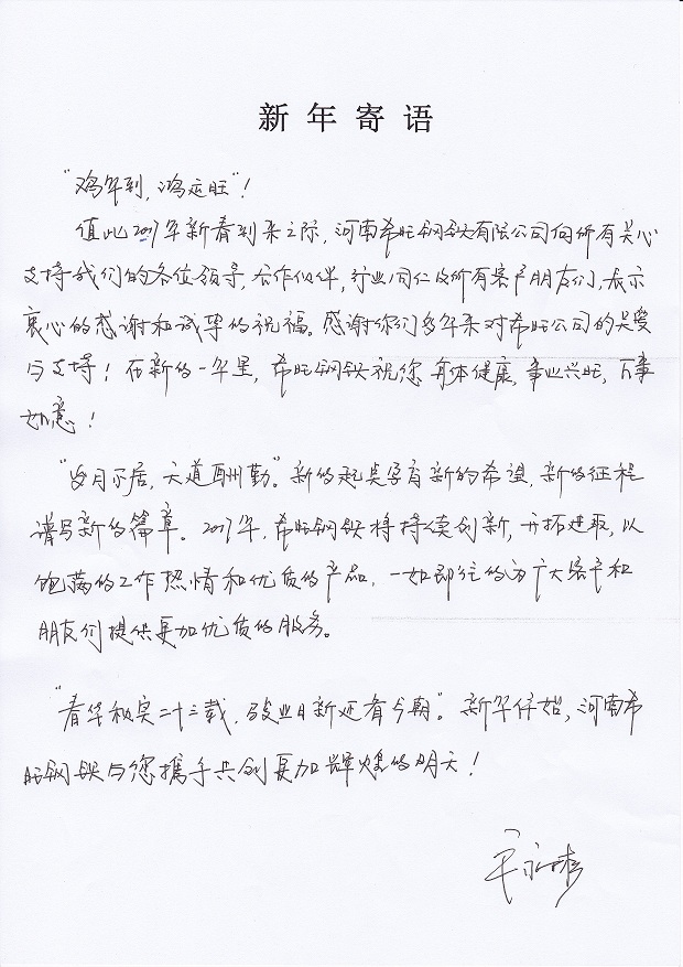 您好!感謝您一直以來對希旺鋼鐵的鼎力支持,在2017年農歷新年到來之前,在此先預祝大家新春愉快!衷心祝愿大家過個歡樂、祥和的春節,年吉祥!希旺鋼鐵祝您新的一年萬事如意!